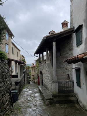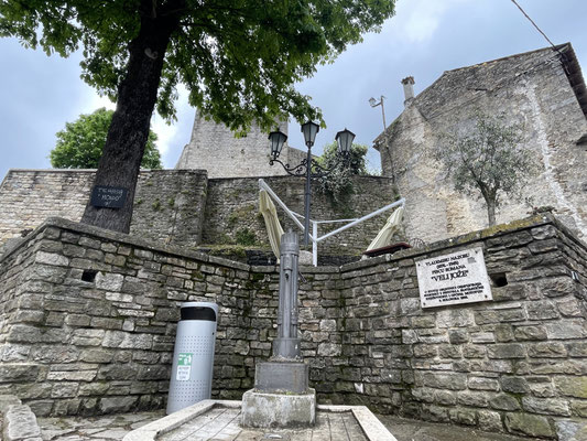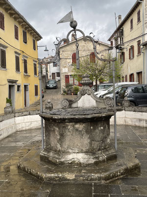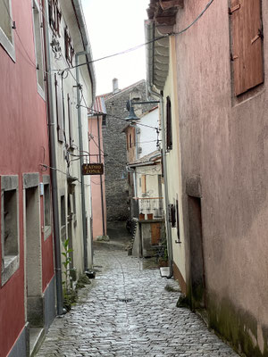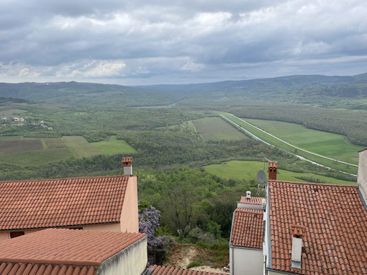 zurück auf der Hauptstrasse erreicht man in weiteren 7 km die Stadt Buzet, das Hoch auf einer Bergkuppe thront und schon von weitem zu sehen ist. Auch diese Stadt ist venezianisch geprägt und war galgolitisches Zentrum. Einen Parkplatz finden wir in der Nebensaison nahe oben beim Stadttor. Wir schlendern hier durch die gepflasterten Gassen vorbei an dem gut erhaltenen, schönen Stadtbrunnen, gepflegten Gärtchen und Hauseingängen. Wir steigen auf die Stadtmauer und geniessen den Ausblick auf die wild- und trüffelreichen Wälder.