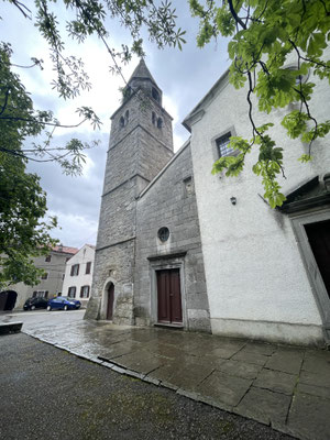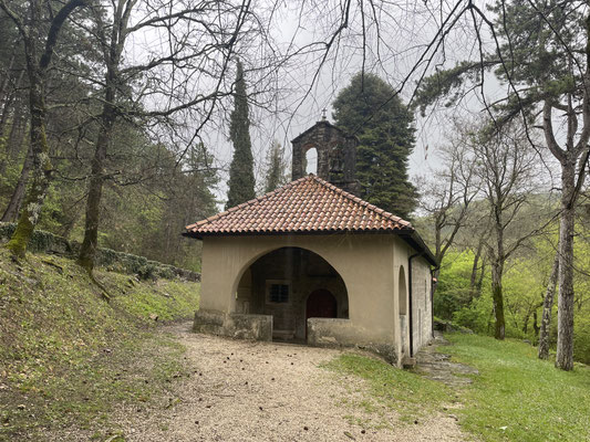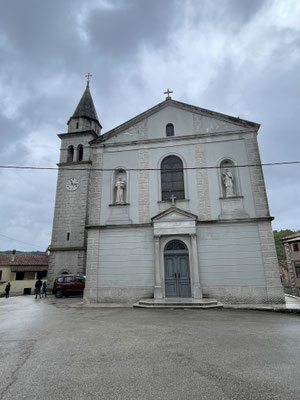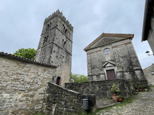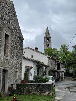 Unser Ziel ist aber der Nebenort Beram. Hier parkieren wir auf dem kleinen Kirchplatz und laufen zur Waldkapelle Sv Marija na