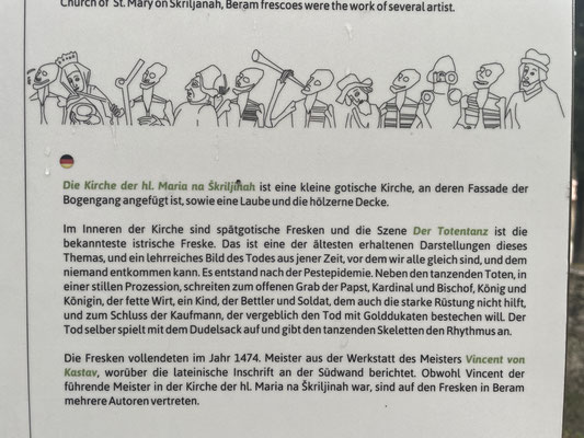 Škriljinah mit den Fresken des Totentanzes. Diese bunte Bildpracht aus 1474 von Vincent aus Kastar hat das Kirchlein berühmt gemacht. Ein langer Menschenreigen tanzt da von der Wiege bis