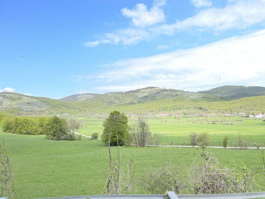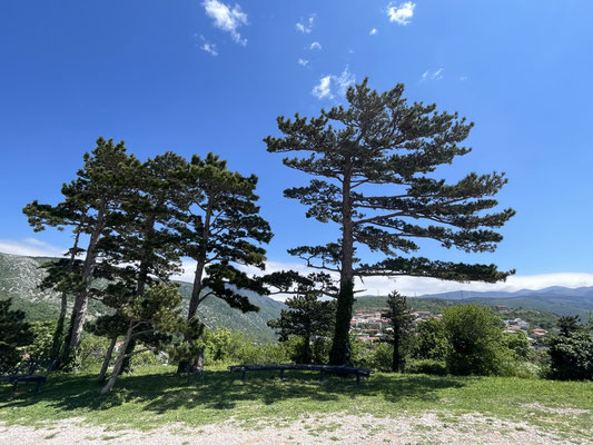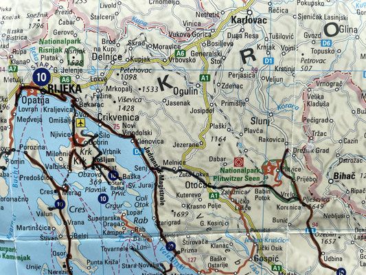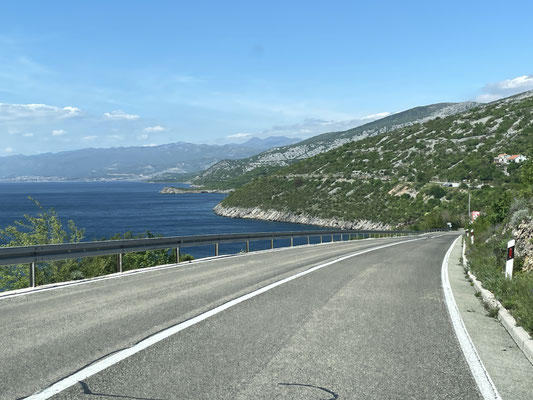 Zwei Stunden später sind wir auf dem Weg Richtung Senj. Wir fahren erst durch Wald- und Wiesenland bis wir an einer windigen Kuppe ankommen. heute bläst der Bora-Wind stark. Die Aussicht auf Senj und die Inseln ist herrlich, das Wetter plötzlich wolkenlos. Die Strasse kurvt durch einige Haarnadelkurven über den Vratnik-Pass bis nach Senj herunter. Wunderbar!
