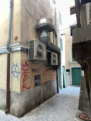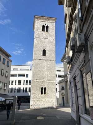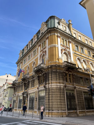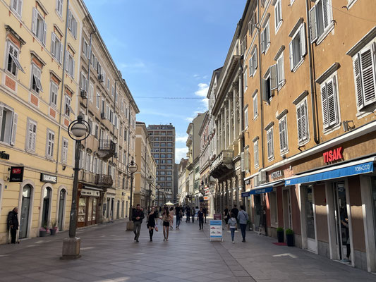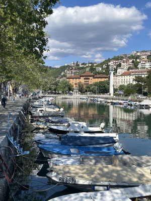 Wir kurven der Küste entlang vorbei an den Bade- und Ferienorten Novi Vinodolski und Crikveniza bis nach Rijeka. Der Verkehr ist einer Grossstadt angemessen, wir haben aber Erfolg und finden einen Parkplatz beim Fährhafen, nahe der Altstadt. Hinter der schmutzig grauen Schale und den vielen wüsten Hochhäusern, den Raffinerien und dem Industiehafen verbirgt sich nämlich eine schmucke Altstadt. Man kann an den grossen edlen Häusern mit den verschnörkelten Fassaden die die ehemalige Pracht erkennen. Die eine oder andere Jugendstil-Fassade wirkt aber immer noch marode, man spürt aber, dass in Rijeka etwas geht und der Glanz langsam zurückkehrt. Die Fussgängerzone Korso ist die Hauptgeschäftsachse der Altstadt. Wir schlendern durch den Uhrenturm mit dem habsburgischen Doppeladler hindurch in die hinteren, kleineren Gässchen bis zum schiefen Turm zum Mariendom gehören.