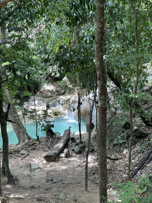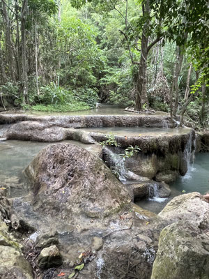 Die Nacht auf den schwimmenden Häusern und das gediegene Frühstück waren grossartig. Punkt 7 Uhr führen dann die ersten Long-Tail-Boote vorbei und weg war die friedliche Ruhe in der Natur. Um 9 Uhr führ unser Boot zum Pier, wo uns Korn auch schon wieder erwartete. Heute erwartet uns der Erawan Nationalpark mit den 7 Wasserfällen. Dieses Ausflugsziel ist sehr beliebt und liegt 65 km nordwestlich von Kanchanaburi.