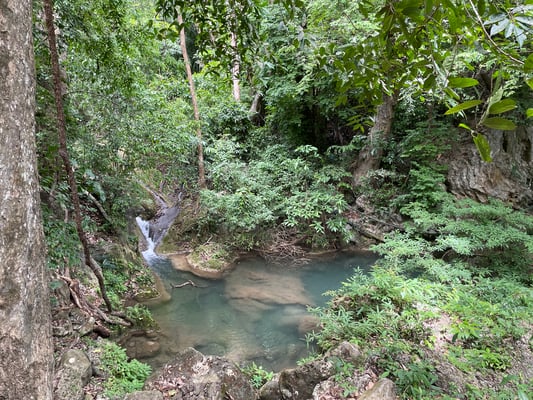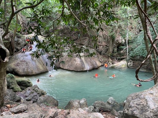 Wir wandern langsam und dem feucht-heissen Klima angepasst bis zur siebten Stufe hoch. Wir benötigen etwa eine Stunde. Leider sind wir auch nicht allein unterwegs. Oben angekommen tauchen wir ins kühle Wasser. Die Fische knabbern an unseren Füssen. Besonders schön und idyllisch sind die 2., 4. und 5. Stufe des Wasserfalls. Unterwegs sehen wir sogar Affen ganz nahe. Wir wandern gemächlich wieder nach unten und hoppen noch in weitere Pools.