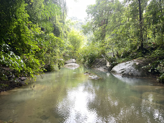 schauen, dass man nicht ausrutscht. Beim Flussabschnitt Wang Pai könnte man baden, aber die Strömung ist nach all den Regentagen zu stark. Wenig weiter kommen wir, über Felsen und Steine