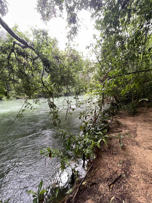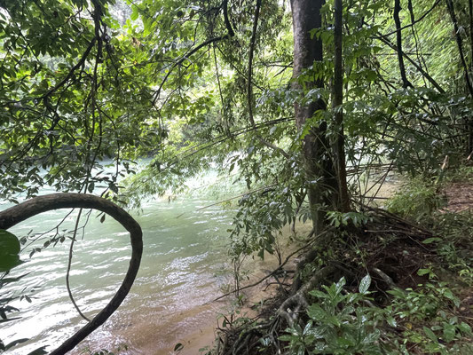 wenn man sie berührt und wo die spitzigsten Stacheln zu finden sind. Wir nehmen immer wieder Abzweigungen auf schmalen Pfaden hinunter zum Flussufer. Die Wege sind schlammig und weich. Man muss