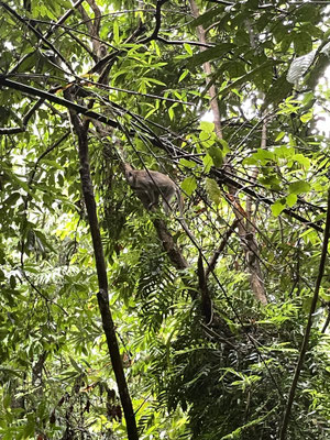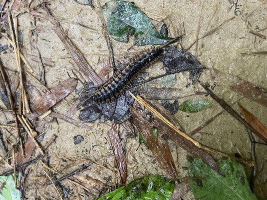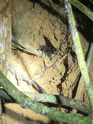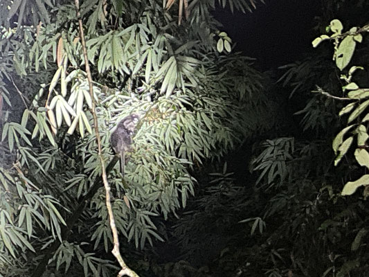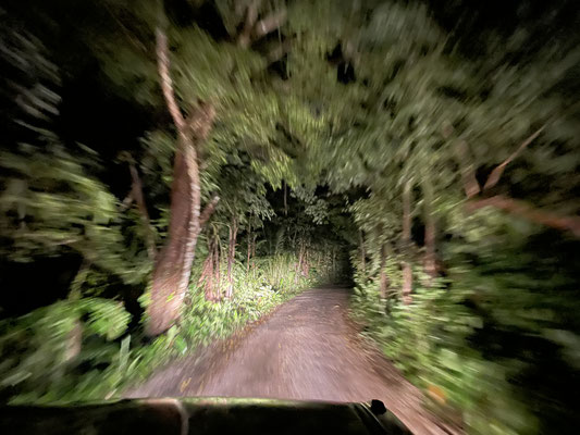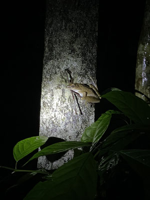 Wieder zurück heisst es schnell duschen, Nachtessen und sich für die Nachtsafari bereitmachen. Um 19.30 Uhr werden wir wieder abgeholt und fahren in den Nationalpark rein. Wir wandern während zwei Stunden mit Stirnlampen durch den dunkeln Park. Es regnet und es ist feucht-warm, wie es eben in einem richtigen Regenwald ist. Wir entdecken allerlei Kleintiere. Es ist herrlich auf den matschigen Pfaden durch den Dschungel zu laufen.