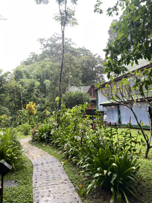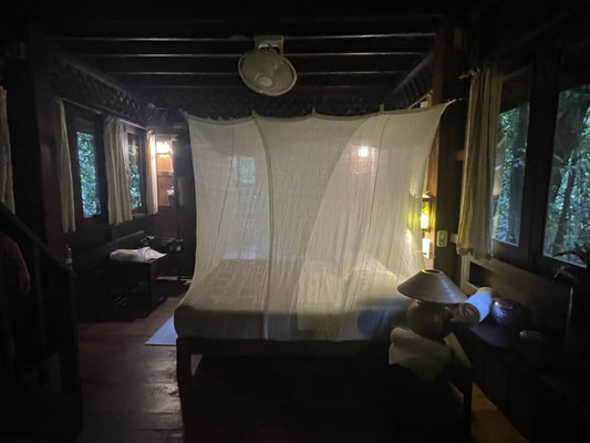 Das Wetter hier ist grau und feucht. Es muss in den letzten Tagen oft geregnet haben, denn in den Feldern ist viel Wasser, dass nicht absickert und die Strassen haben ausgewaschene Schlaglöcher. Spannend ist, dass hier überall die Schuhe vor dem Haus ausgezogen werden, auch im Restaurant. So bleibt der Matsch auf der Strasse. Unser Hotel ist eine Eco-Lodge. Wir bewohnen ein zweistöckiges Baumhaus mitten im Dschungel. Das nächste Bungalow liegt etwas weiter weg, so dass man keinen Sichtkontakt hat. Es ist einfach eingerichtet, aber sehr liebevoll. Wir hatten aber noch gar nicht gross die Gelegenheit, das Häuschen zu geniessen.