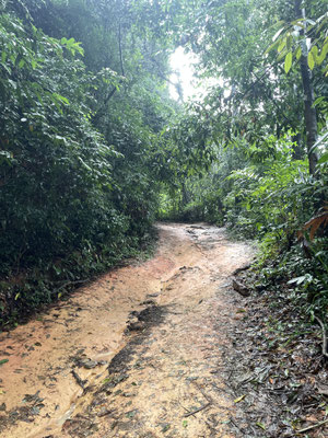 Wir starten für unsere 8 km lange Exkursion durch den Urwald. Der erste Abschnitt ist einfach zu laufen. Ein breiter Waldweg schlängelt sich am Sok Fluss nach Westen. Wir bekommen immer wieder