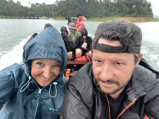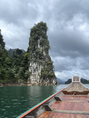 Wir sind froh, dass wir nur sieben sind. Mit uns in der Gruppe sind noch zwei junge Frauen aus London. Wir lassen unser grosses Gepäck da im Office der Agentur und steigen in ein Boot. Der See ist so gross, dass wir schnell alleine unterwegs sind. Das Wetter wechselt im fünf-Minutentakt. Wir ziehen unsere Regenschütze über und werden innert kürzester Zeit pudelnass. Wenig später sind wir vom Fahrtwind wieder trocken. Unsere Erkundungstour dauert 1h40 min. Die Landschaft begeistert uns. 1982 begann man mit dem Bau des Staudamms Rajjaprabha, wobei der Pasaeng-Fluss gestaut wurde und 900 Menschen aus fünf Dörfern mussten ihre Heimat verlassen. Dies stiess anfangs auch auf Widerspruch. Entstanden ist der 162 km2 grosse Chiew-Lan See, an diesem Grund in 100 Metern Tiefe nun diese Dörfer liegen. Aus dem Wasser ragen kleine Inseln aus Karstfelsen fast senkrecht empor, ebenso Kronen alter, abgestorbener Bäume und ringsherum liegt dichter Urwald. Wir fahren zu der bekanntesten Felsformation Guilin und machen einen 10-minütigen Fotostopp. Die Landschaft ist einmalig schön.