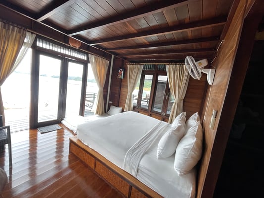Heute Morgen haben wir an der Reception erfahren, dass die gebuchten Basic-Bambushütten bereits voll sind und dass dem Besitzer noch eine andere Anlage besitze. Wir würden kostenlos in diese umgeteilt. Es sei aber Premium. Als wir im 500Rai Resort ankommen staunen wir ein weiteres Mal, Chic und gediegen, so essen wir auch unser Mittagessen und geniessen die freien Stunden in unserem schwimmenden Haus am See. Es stehen sogar zwei Kanus an unserem Steg.